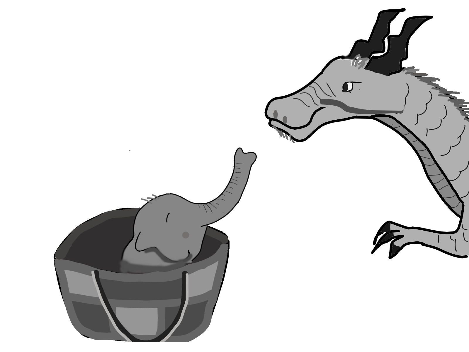 「安部さん、私ね、夢を見ました。私は小さいおぢさんのヘタをつけてマルに乗ってました。私がヘタをつけるとマルと私はちょうど普通の象と人間の大きさと同じ関係になるんです。私はマルに乗って気持ちのいい草原をお散歩していたんです。マルは鼻をブラブラさせながら歩いてました。あの子は、気持ちが乗ってくるといつも鼻をブラブラさせるんです。それでしばらく歩くと大きな河の畔についたんです。待っていると河から大きな竜が現れました。ジョンでした。ジョンはとても立派になってました。最初はトカゲみたいだったのに・・・マルは背中の上の私を鼻で巻き取ると地面にやさしく降ろしました。で、鼻でハートマークを作って額にチューしてくれたんです。でもその後、鼻で私をくるって後ろ向きにして背中をつんつん押すんです。私が振り返ろうとしても鼻で器用に私を後ろ向きにして。きっと、私に振り返らず自分の足でしっかり歩けって、言いたかったんだと思う」