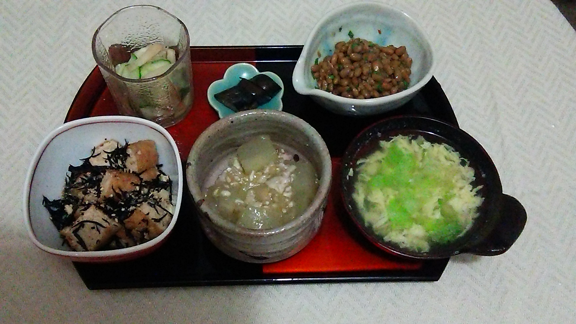 冬瓜のあんかけ、ひじき煮、きゅうりとらきょうの甘酢和え、納豆、かき玉スープ